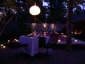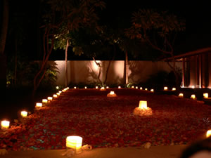 鍵を開け、扉を開けると、プールに通じる廊下の両端にもキャンドルが並べられ、そのキャンドルの明かりにそって部屋へ入っていくと、プール一面に赤や黄色など色々な色の花びらがひき詰められ、大きめなキャンドルが3つ浮いていました。