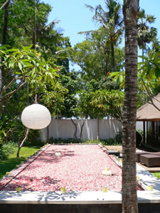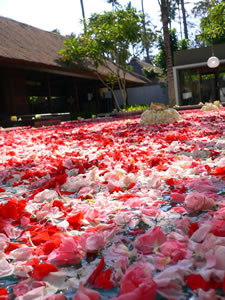 最後の、朝食をレストランで食べ、チェックアウトまで最後の一泳ぎと、昨日、キャンドルナイトディナーのためプール内にひきつめられた花びらの中を優雅に泳いだ。
