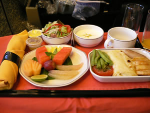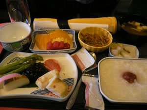ビジネスクラスの朝食です。上が洋食、下が和食です。
